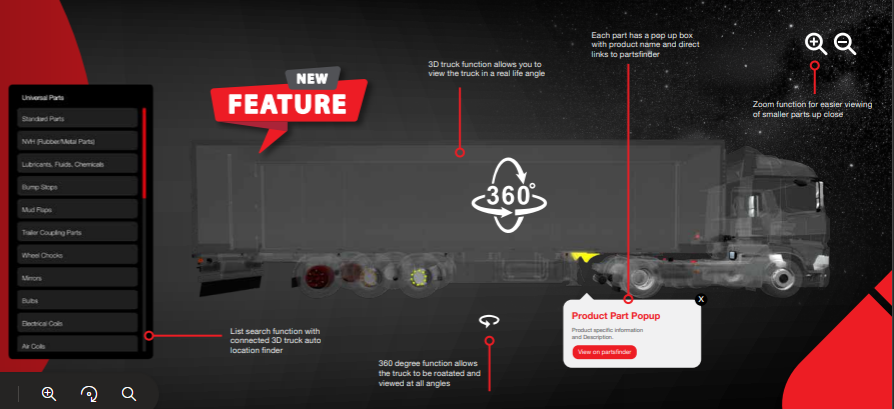 febi makes finding the universal parts you need easier than ever. Simply select the part you need using our innovative 360º rotating 3D truck model and you will be seamlessly directed to our partsfinder catalogue where you will find all the relevant details about the selected component. This intuitive solution streamlines the process, ensuring you can quickly and effortlessly find the exact part you are looking for.